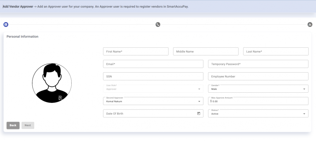 Add an Approver user for your company. An Approver user is required to register vendors in SmartAccuPay.