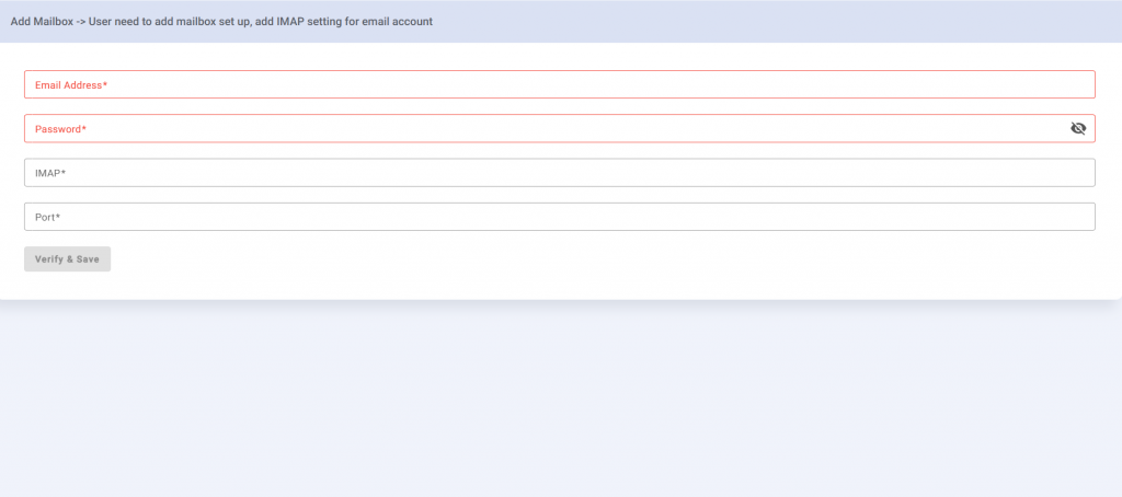 User needs to set up mailbox by adding IMAP settings for their email account.